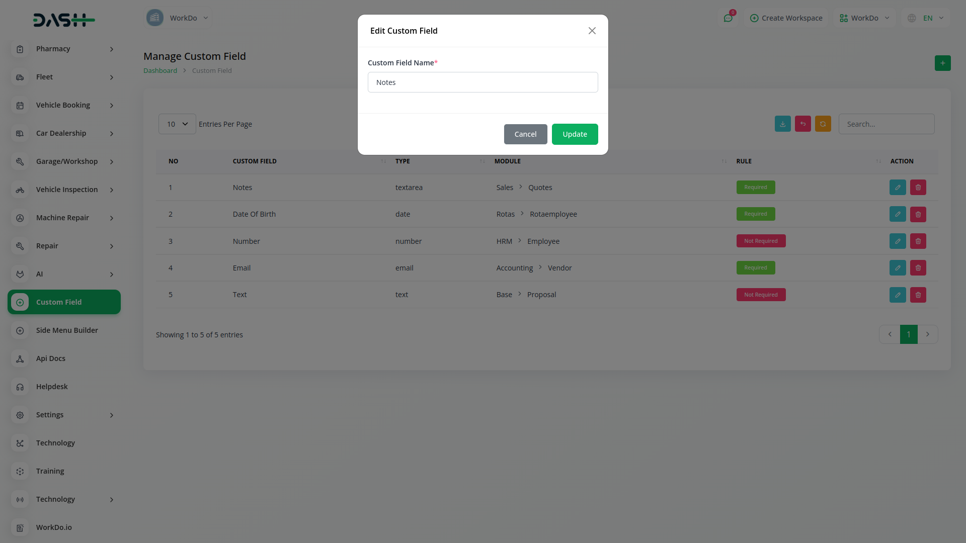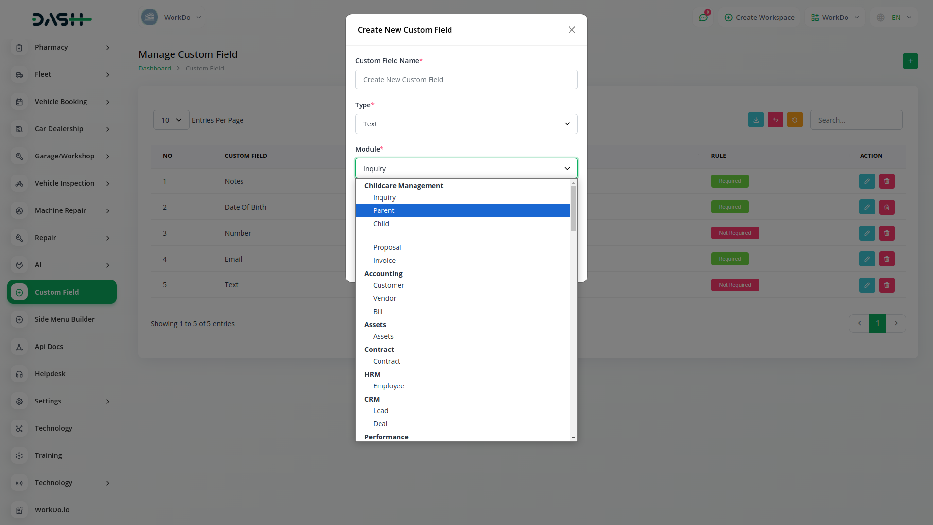Custom Filed use in HRM, Account, Lead, Assests, Contract, Performance, Pos, Retainer, Sales, Taskly all modules.You can using custom filed collect additional information about all modules as you like.